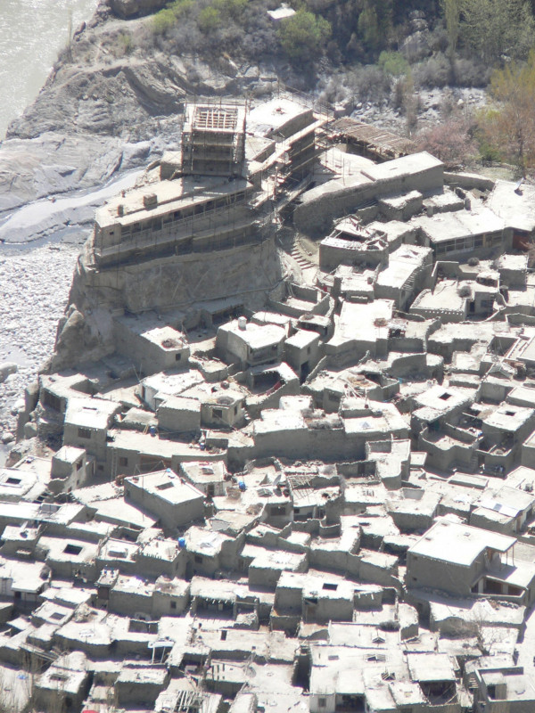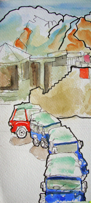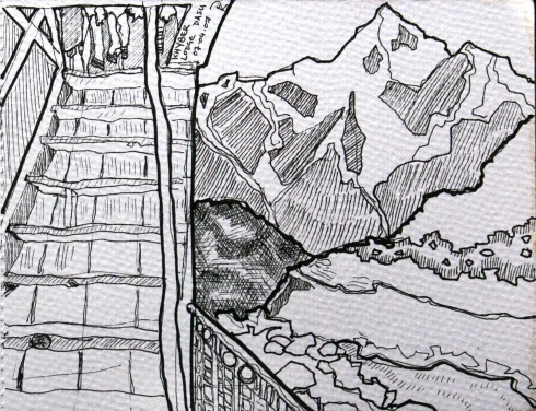 I sat on the verandah of our hotel, at around 4,500 thousand feet, and sketched the ancient Baltit Fort, overshadowed by the looming mountains. On the road, many miles from anywhere, between Besham and our destination Karimabad, we stopped at a very old roadside café with a roof terrace up some very rickety wooden stairs. We stayed a while in the sunshine, eating, drinking tea and soaking up the extraordinary views. The transport café was not considered salubrious enough for the very few women travellers so the roof terrace was provided as a private space . We definitely got the better deal!