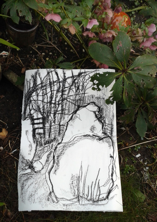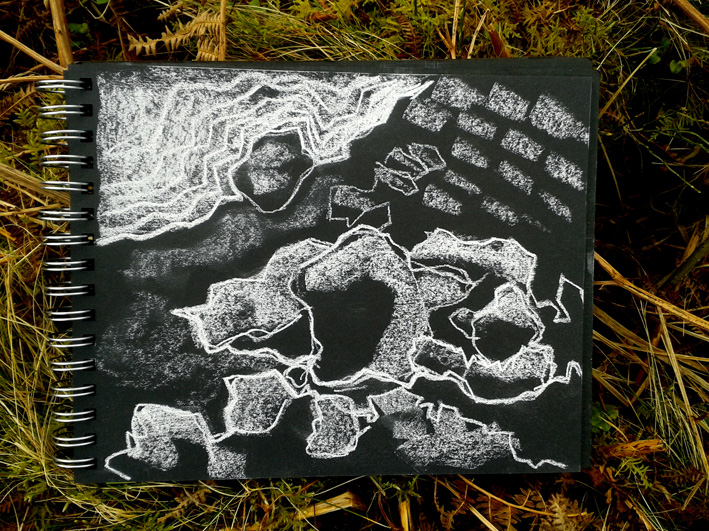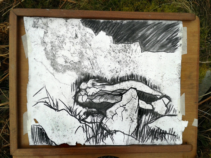 At first I just went along with some sheets of white paper and charcoal and my drawing board. Although I enjoyed doing the drawings, the white paper just didn’t feel right, so I tried marbled paper and I also used white conte crayon onto black, but I still wasn’t happy. Then I found some experimental sheets of paper I’d prepared with gesso and some walnut ink I’d made and that gave me my style and focus. I worked over the walnut base with charcoal, carbon and conté crayons in white and sanguine. The standing stones were relatively easy to draw, but I had to take a different approach with some sites where cairns had disappeared into just contours and hummocks.