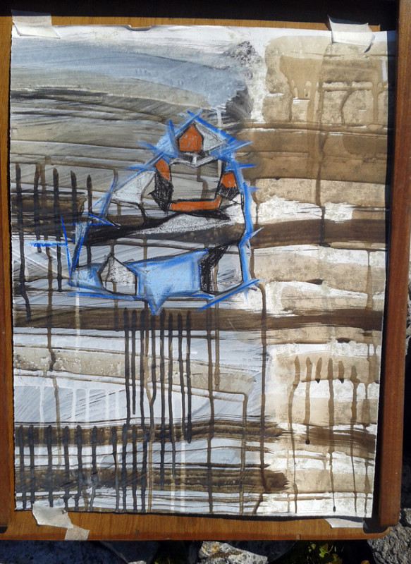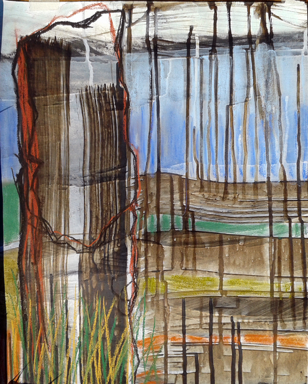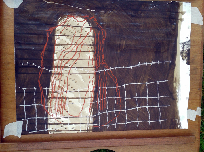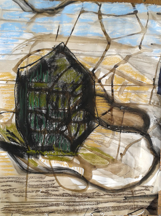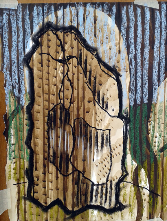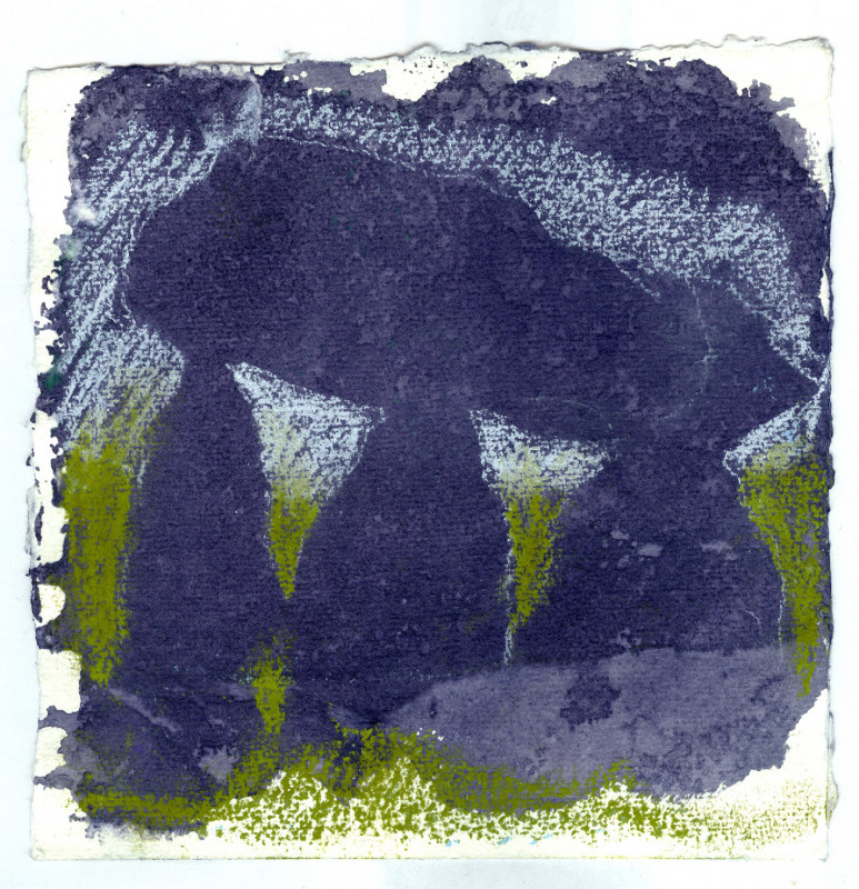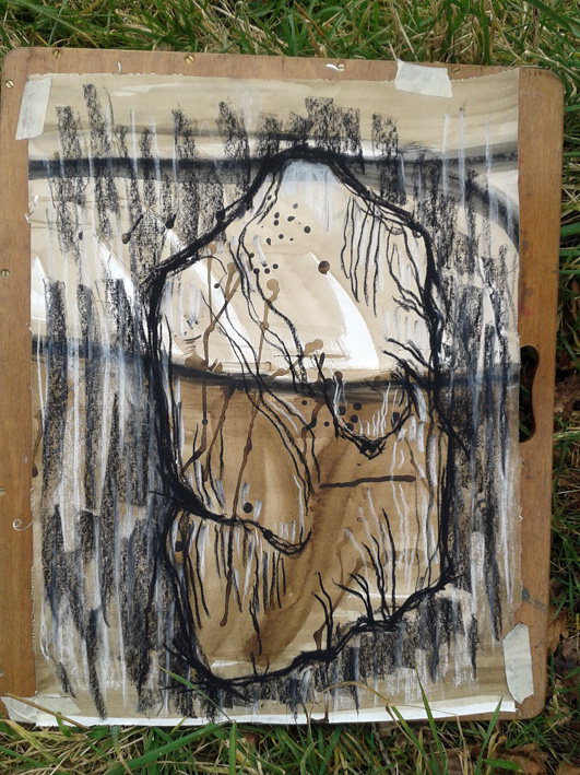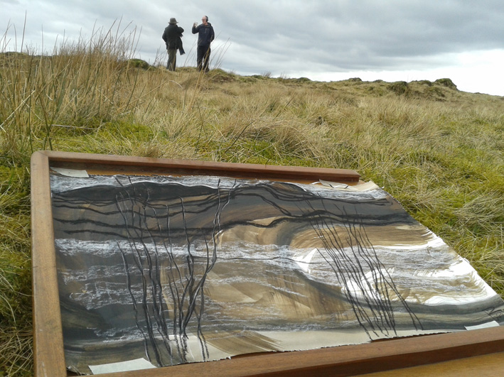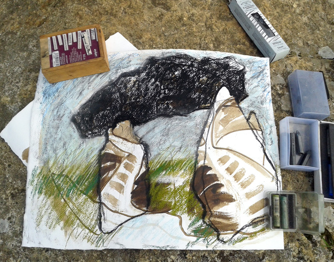 As we journeyed across South Wales, following the Mabinogion trail, my work began to get quite abstract – not like my usual representative art – but the stones somehow encouraged me to experiment, as did the weather! The paper preparation in the studio takes a long time and is painstaking, but the drawings in the field have to be done quickly, the weather can be brutal. As time went on, I started to use Daler Rowney soft pastels on top of the prepared walnut paper.