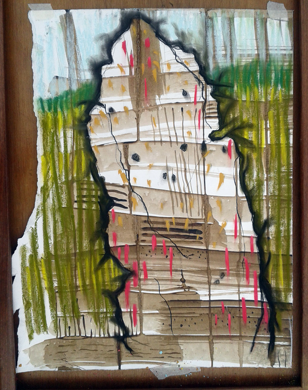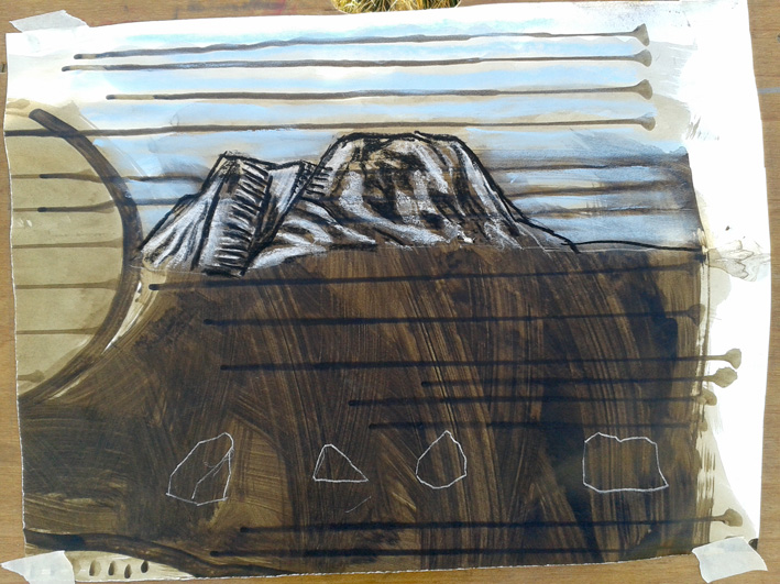 I never worked with landscape. Didn’t get it. I’m a townie, I like the streets and the brutal built environment. I like drawing people. I could never get a handle on landscape – it was all too big for me. Until I went to Pakistan almost 20 years ago and spent a week up in the Karakoram Mountains near the Chinese border. I experienced the intervention of humans in the landscape, the work of ancient artists; and this set me on a journey to discover the ancient heritage of my own country, Wales, which I had taken for granted. This was my way in to the landscape, but even so, it took a few years, churning around wherever it is that artistic inspirations comes from.