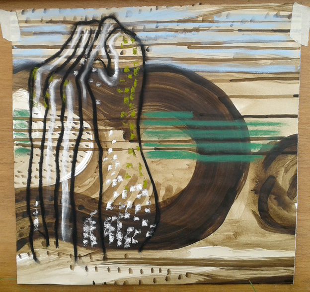 The Cwrt Sart monument in Neath had been in the school playground for many years. We visited shortly before the old school was knocked down and replaced with housing, but fortunately the stone has been preserved. It really lent itself to abstraction and I had fun with mark-making, to the puzzlement of the schoolkids. The legend of Ty’n Y Selar in Margam says that before cockcrow on Christmas Day it uproots itself and goes to the river for a drink. When Saint Samson threw the stone to its present position, the area would have been beautiful, but now it’s hemmed in by a motorway, railway line and industrial estate. It is still magnificent though.